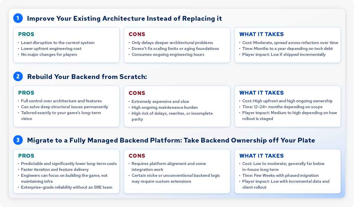 If you’ve identified that your backend needs to change, here are three realistic paths you can take, each with different risks, costs, and timeframes.