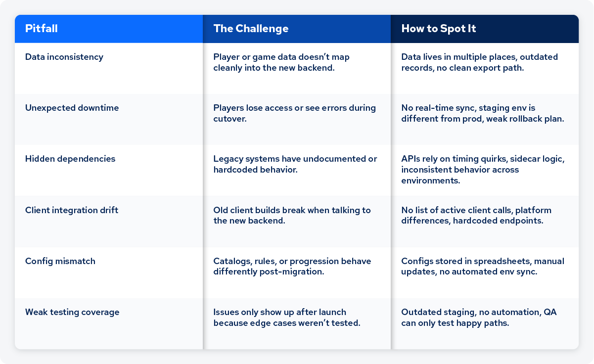 Even with a solid plan, backend migrations come with a few common traps that can slow teams down or cause headaches during cutover. Knowing these early makes the whole process a lot smoother.