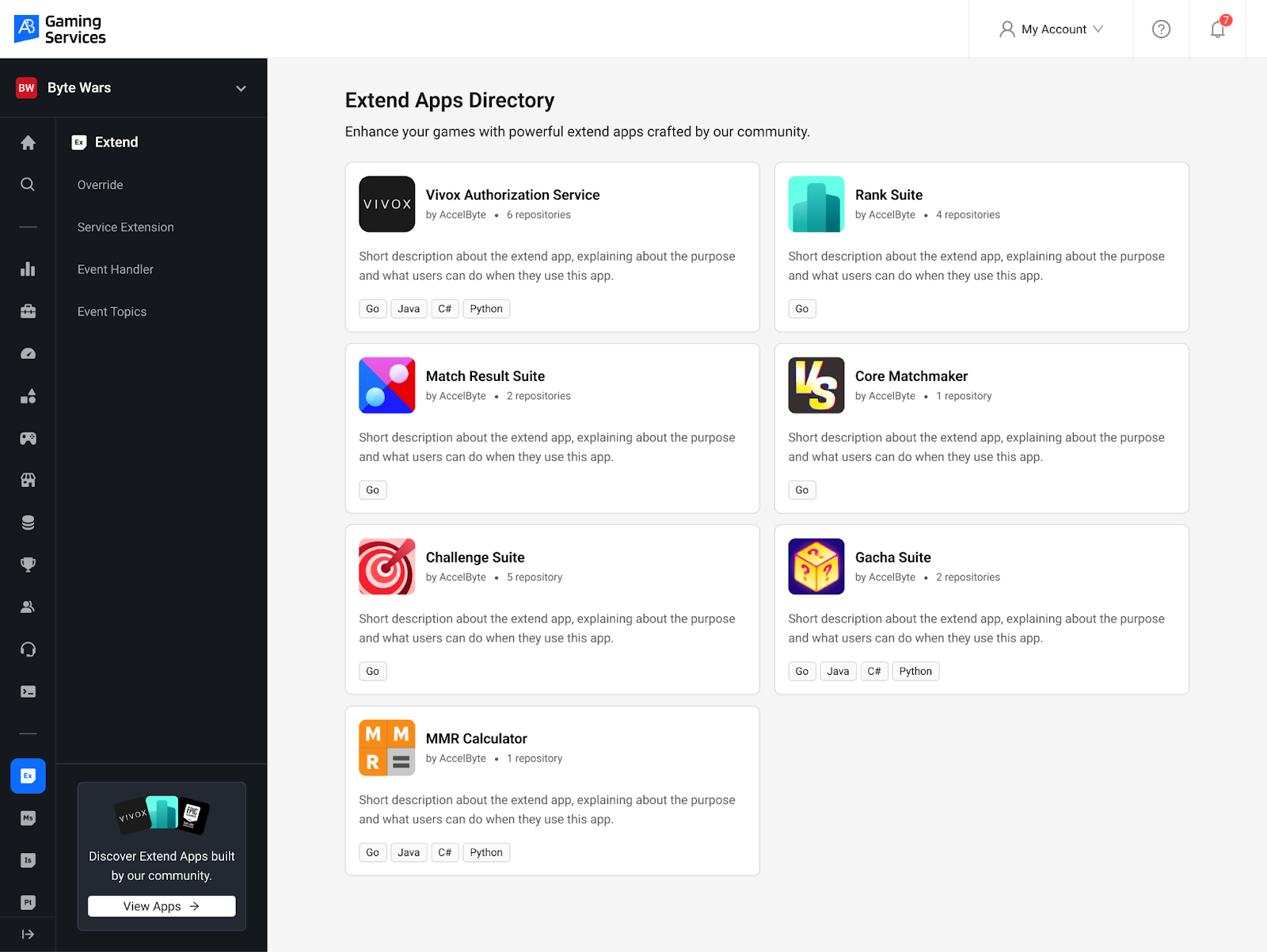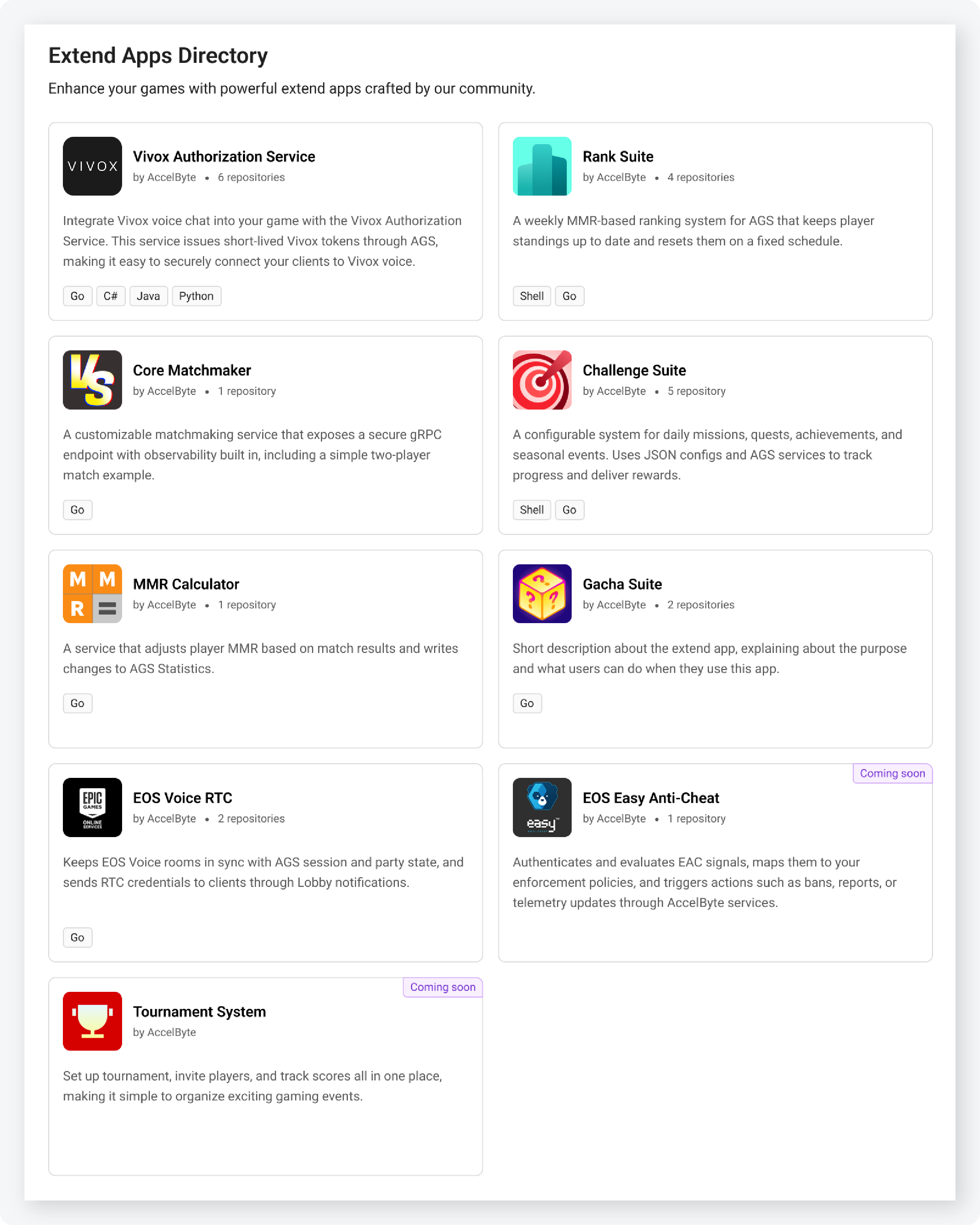 Most game studios need to add custom backend logic to make their games work the way they intend from gameplay rules to LiveOps systems. Extend is AccelByte’s hosted customization framework that lets teams write that logic on top of AccelByte’s backend services without having to host or operate the code themselves. Over time, many studios built similar Extend apps to solve common needs — so we turned those into a directory of open-source apps that you can fork, modify, and run to bootstrap your own backend logic.