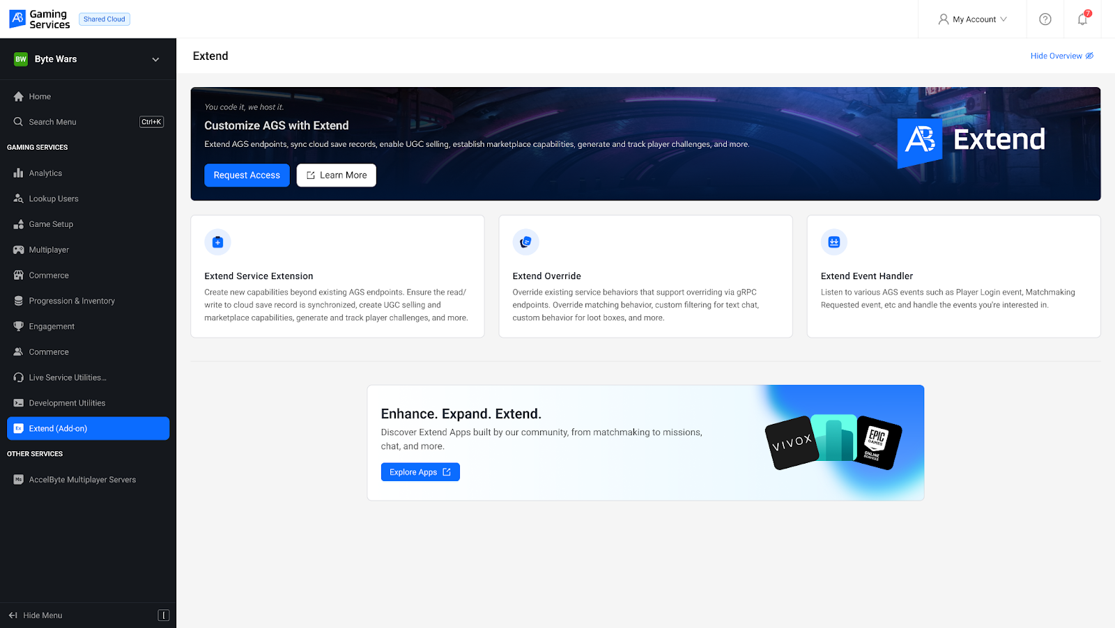 2. From within AccelByte Gaming Services (AGS) accountIf you’re already using AGS and haven’t turned on Extend yet, you’ll see a banner on the Extend Overview page that takes you to the public directory.