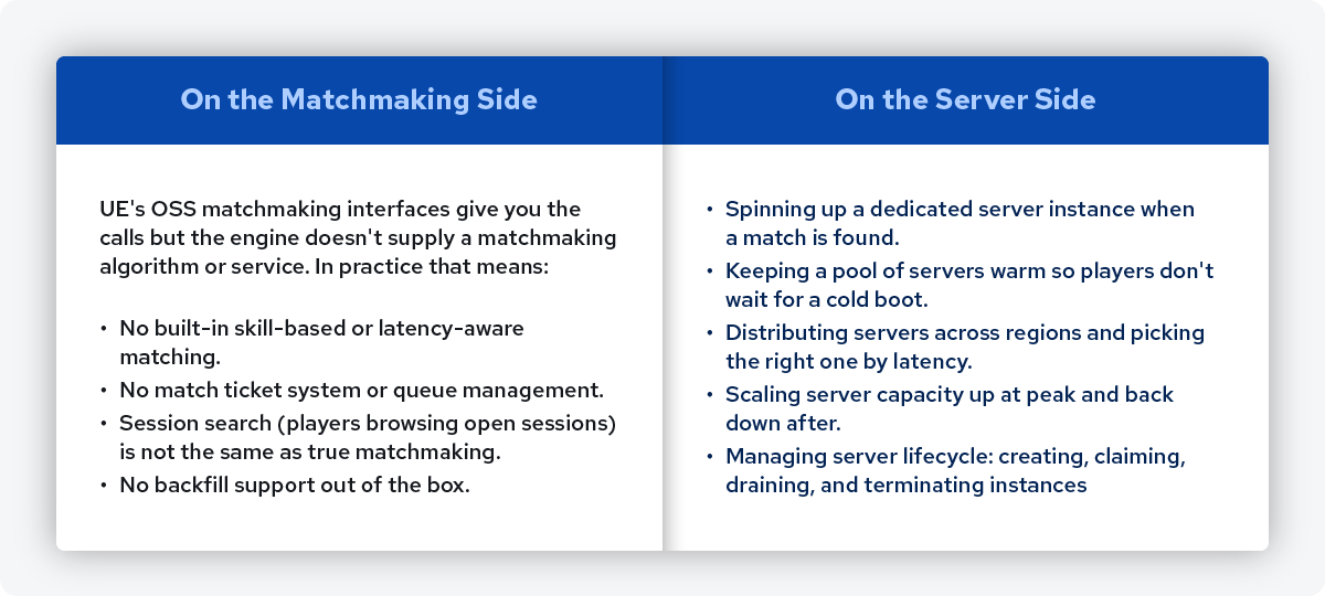 These aren't edge cases, they're the core of what shipping a multiplayer game with dedicated servers actually requires. None of them are in the engine. Let’s see how studios typically fill that gap.
