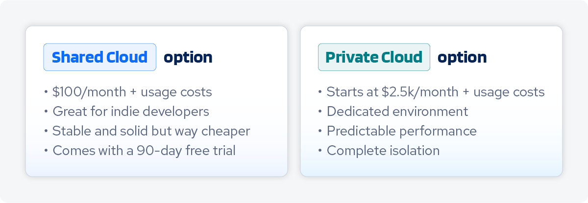 Both options use the same codebase and tools. You can start multi-tenant and move to single-tenant later when you need it. No weird migration or rebuilding anything.